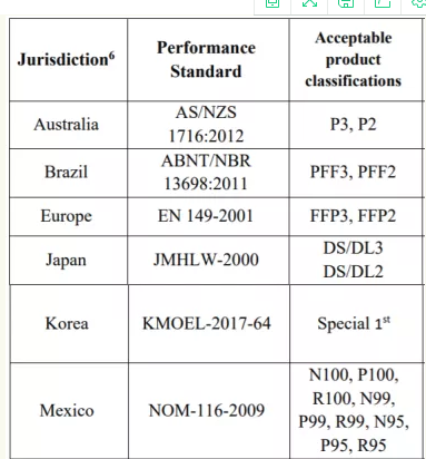 CDC優(yōu)化呼吸器供應(yīng)策略中推薦的NIOSH替代標(biāo)準(zhǔn),除了中國標(biāo)準(zhǔn):GB 2626-2006外,其他均被EUA采納。