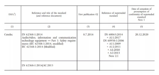 依據(jù)歐盟CE標(biāo)志對(duì)于“置于市場(chǎng)”的時(shí)間認(rèn)定,只要產(chǎn)品進(jìn)入銷售之時(shí)就必須符合法規(guī),說明產(chǎn)品在2020年12月20日起將無法以EN 60950-1與EN 60065標(biāo)準(zhǔn)進(jìn)入歐盟市場(chǎng)。