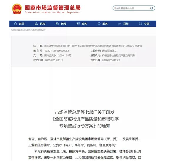 近日,為加強(qiáng)對防疫物資產(chǎn)品的質(zhì)量監(jiān)管,維護(hù)市場秩序,市場監(jiān)管總局、國家發(fā)展改革委、工業(yè)和信息化部、公安部、商務(wù)部、海關(guān)總署、藥監(jiān)局七部門聯(lián)合開展全國防疫物資產(chǎn)品質(zhì)量和市場秩序?qū)m?xiàng)整治行動(dòng)。于2020年05月13日,印發(fā)了《全國防疫物資產(chǎn)品質(zhì)量和市場秩序?qū)m?xiàng)整治行動(dòng)方案》的通知。