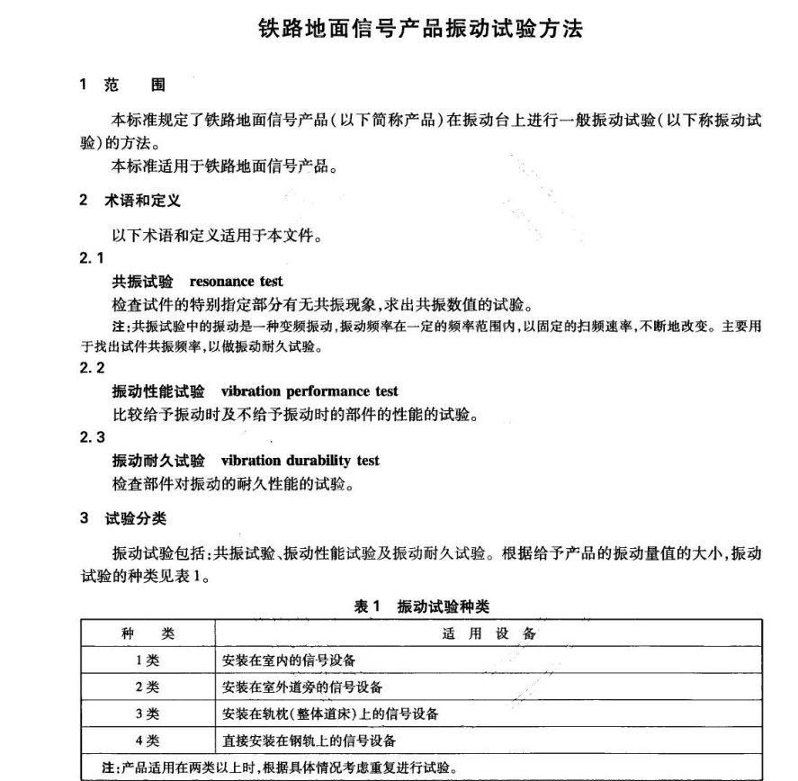 本標(biāo)準(zhǔn)適用于鐵路地面信號(hào)產(chǎn)品的振動(dòng)試驗(yàn),這些產(chǎn)品包括但不限于信號(hào)機(jī)、道岔轉(zhuǎn)換裝置、軌道電路設(shè)備等。目的是驗(yàn)證這些設(shè)備在運(yùn)輸、安裝及運(yùn)行過(guò)程中可能遇到的各種振動(dòng)條件下能否正常工作。