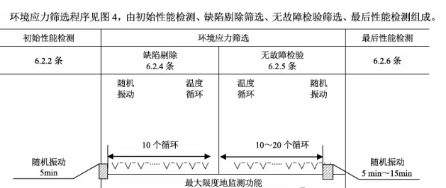 篩選過(guò)程中應(yīng)對(duì)產(chǎn)品的功能和性能進(jìn)行監(jiān)測(cè),在最長(zhǎng) 20個(gè)循環(huán)內(nèi)只要連續(xù)10個(gè)循環(huán)不出現(xiàn)故障,產(chǎn)品即通過(guò)了溫度循環(huán)篩選;在最長(zhǎng)15min內(nèi)連續(xù) 5min不出現(xiàn)故障,產(chǎn)品即通過(guò)了隨機(jī)振動(dòng)篩選。