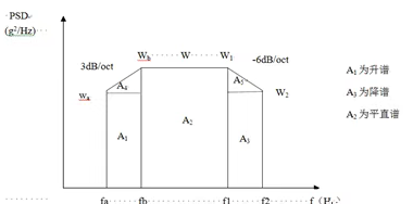 為了簡便起見,往往將功率譜密度曲線圖劃分成若干矩形和三角形,并利用上升斜率(如3dB/oct)和下降斜率(如-6dB/oct)分別算出wa 和w2,然后求各個幾何形狀的面積與面積和,再開方求出加速度總均方根值。