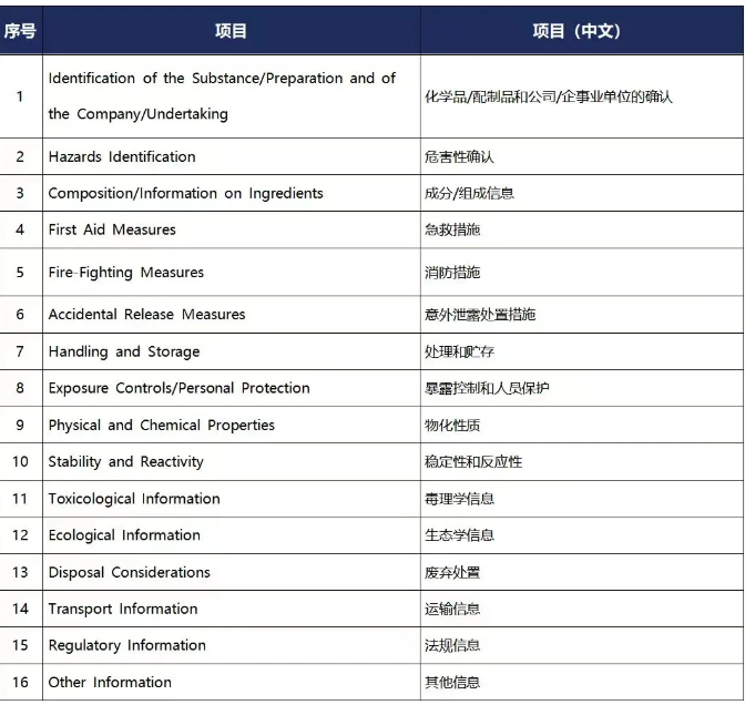 MSDS有規(guī)定格式和標(biāo)準(zhǔn)依據(jù),不同國(guó)家有不同的MSDS標(biāo)準(zhǔn),常規(guī)MSDS一般包括16項(xiàng):