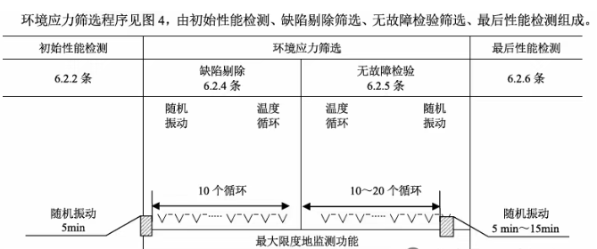 篩選過程中應(yīng)對(duì)產(chǎn)品的功能和性能進(jìn)行監(jiān)測(cè),在最長(zhǎng) 20個(gè)循環(huán)內(nèi)只要連續(xù)10個(gè)循環(huán)不出現(xiàn)故障,產(chǎn)品即通過了溫度循環(huán)篩選;在最長(zhǎng)15min內(nèi)連續(xù) 5min不出現(xiàn)故障,產(chǎn)品即通過了隨機(jī)振動(dòng)篩選。