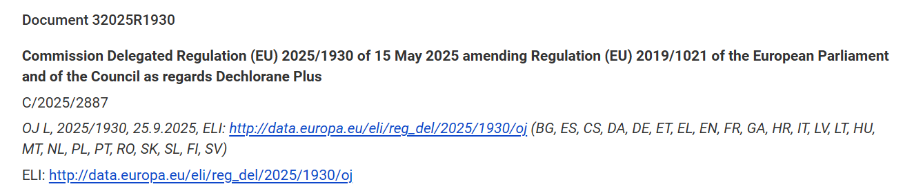 2025年9月25日,歐盟在其官方公報(bào)發(fā)布修訂法規(guī)(EU) 2025/1930,在POPs法規(guī)(EU)2019/1021附錄I新增德克隆的限制。至此,POPs法規(guī)附錄I的A部分限制的物質(zhì)達(dá)到32項(xiàng)。修訂法規(guī)于歐盟官方公報(bào)上公布后第20日起生效。