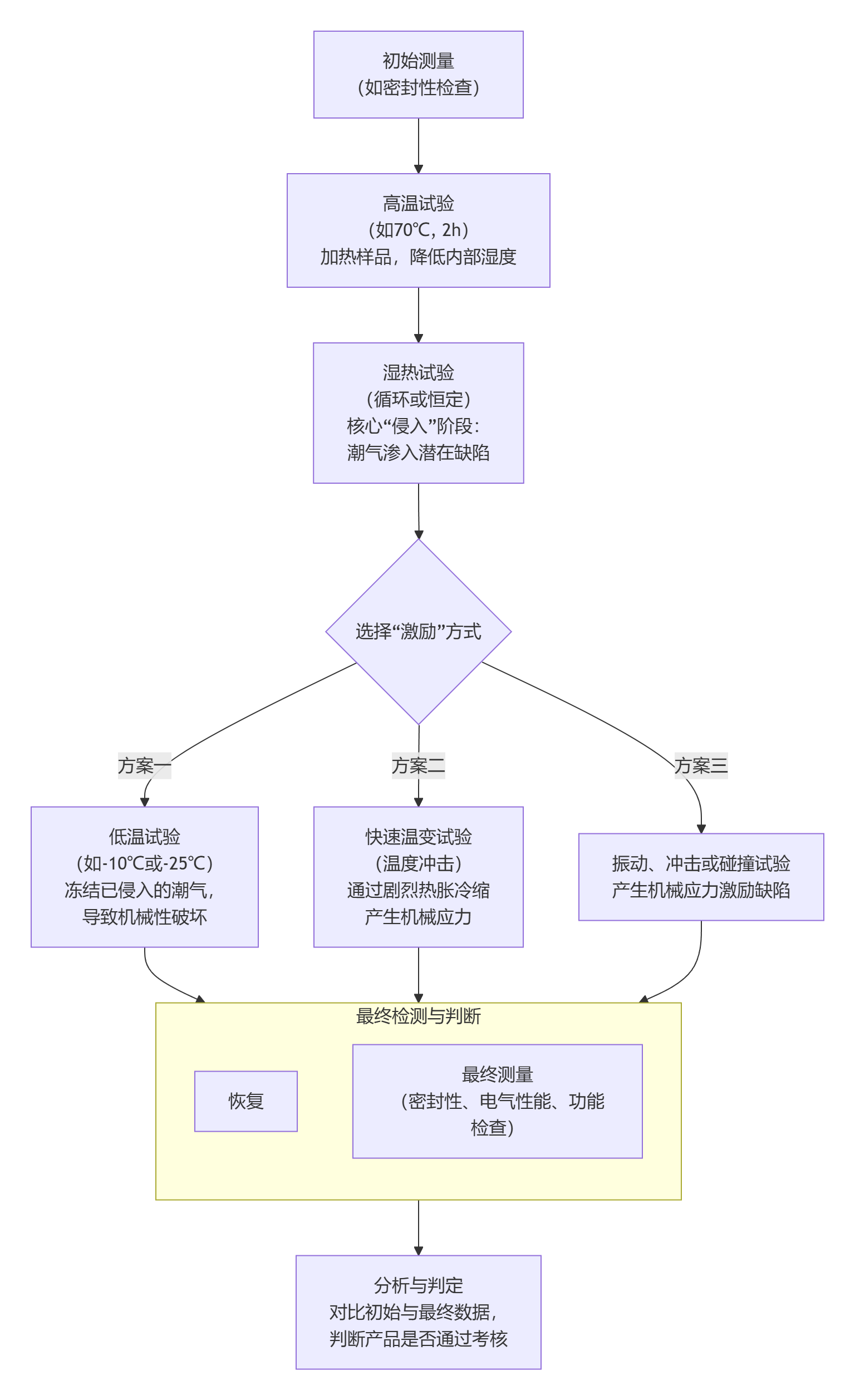 激勵(lì) (Stimulation):然后施加一種極端的機(jī)械或氣候應(yīng)力(如低溫、溫度沖擊或振動(dòng)),來(lái)“激勵(lì)”或“激活”這些缺陷。這個(gè)應(yīng)力會(huì)使已侵入的潮氣產(chǎn)生物理或化學(xué)作用(如結(jié)冰膨脹、加速腐蝕),或者使缺陷擴(kuò)大變得可檢測(cè)。 3.