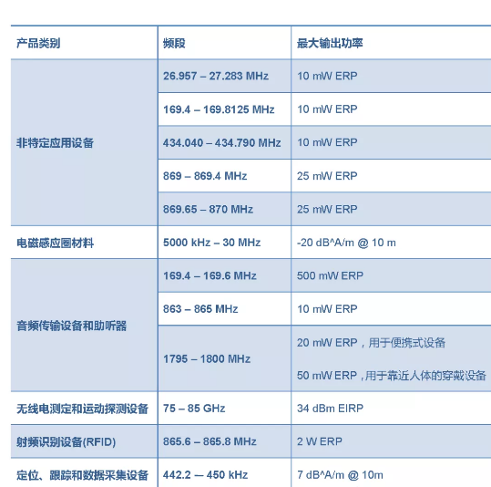 近期,摩洛哥國家電信管理局(ANRT)發(fā)布了一項(xiàng)新的短距離無線通信設(shè)備(SRD)規(guī)定ANRT/DG/N°07/2020。新規(guī)定為SRD設(shè)備的各種使用場景提供了額外的頻段,例如大功率射頻識(shí)別,其他技術(shù)要求保持不變。新增的頻段及其最大輸出功率限制如下:
