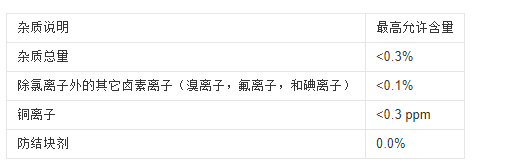 鹽溶液應(yīng)通過把5+/-1質(zhì)量份氯化鈉溶解到95份水中來制備,水全都必須符合D 1193 試劑水規(guī)格中Ⅳ型水的要求(鈉離子可以不管,只要氯離子含量在本規(guī)程范圍內(nèi)就行)。應(yīng)注意鹽的化學(xué)成分。使用的鹽應(yīng)為氯化鈉,其中雜質(zhì)總含量不得超過0.3% (質(zhì)量)。除氯離子外的其它鹵素離子(溴離子,氟離子,和碘離子)的含量應(yīng)低于鹽含量的0.1% (質(zhì)量)。銅離子含量應(yīng)低于0.3 ppm (質(zhì)量)。不得使用含防結(jié)塊劑的氯化鈉,因為防結(jié)塊劑會起抗腐蝕劑作用。表1列出了鹽中雜質(zhì)的最高允許含量。在買賣雙方協(xié)議的基礎(chǔ)上,可要求對上述化學(xué)組成中未做規(guī)定的元素或化合物進(jìn)行分析,確定最高允許含量。