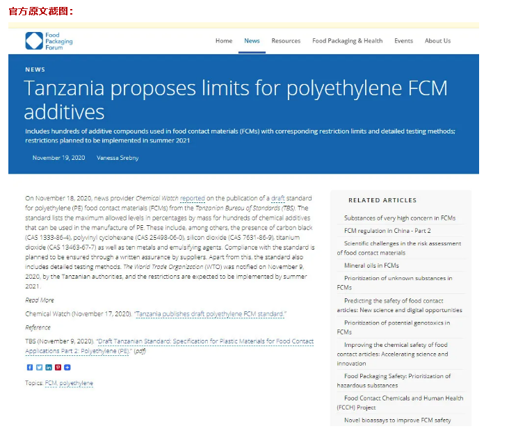 2020年11月18日,據(jù)化學(xué)觀察報道,坦桑尼亞標準局(TBS)發(fā)布食品接觸材料(FCMs)聚乙烯(PE)標準草案。