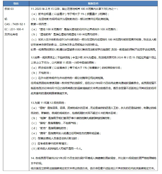 2021年1月26日,歐盟在其官方公報(bào)發(fā)布(EU) 2021/57法規(guī),再次更新REACH附錄XVII第63條目關(guān)于鉛的要求,將其適用范圍擴(kuò)大到在濕地內(nèi)或附近使用的射擊彈藥。該法規(guī)將自歐盟官方公報(bào)上發(fā)布之日起20天內(nèi)生效。