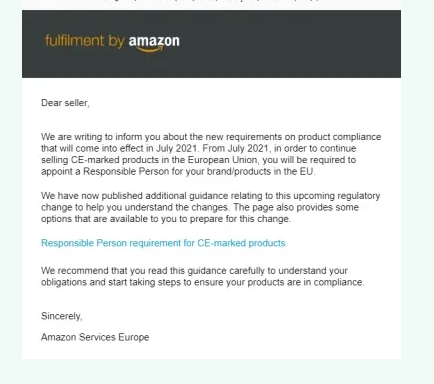 在這之前,產(chǎn)品只需做完CE認(rèn)證,就會(huì)覺得萬事大吉了。不過現(xiàn)在,歐盟已有新的規(guī)則出來了:對于銷售帶有 CE 標(biāo)志的商品,亞馬遜強(qiáng)調(diào),必須要在 2021 年 7 月 16 號(hào)之前,確保具有位于歐盟的負(fù)責(zé)人(簡稱歐代)。
