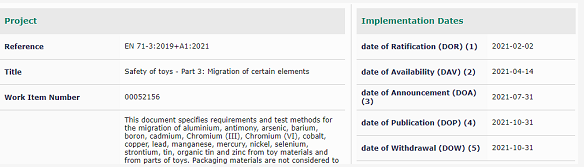 標(biāo)準(zhǔn)EN 71-3:2019+A1:2021將被賦予CEN成員國(guó)國(guó)家標(biāo)準(zhǔn)的地位,與其相沖突的國(guó)家標(biāo)準(zhǔn)將最晚在2021年10月31日被取代。該標(biāo)準(zhǔn)預(yù)計(jì)不久會(huì)得到歐盟委員會(huì)批準(zhǔn),在歐盟官方公報(bào)(OJEU)上發(fā)布之后,被列為玩具安全指令2009/48/EC的協(xié)調(diào)標(biāo)準(zhǔn)。目前相應(yīng)的生效的協(xié)調(diào)標(biāo)準(zhǔn)仍然為EN 71-3:2019。