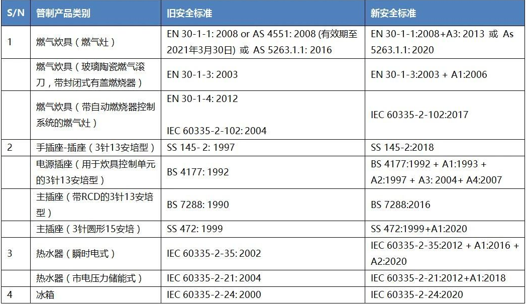 2. 自2022年7月起,下列舊安全標(biāo)準(zhǔn)的管制產(chǎn)品將不能用于重新注冊或更新。
