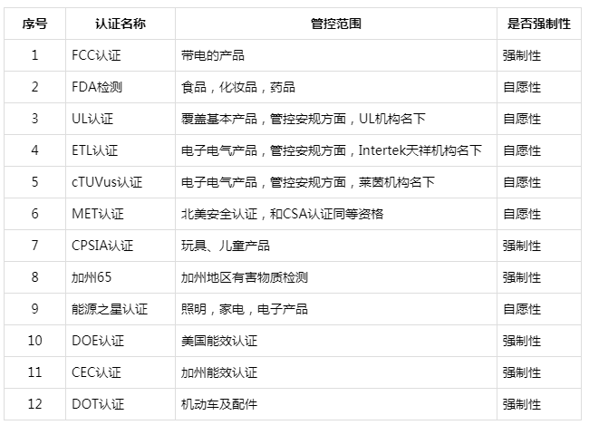 對(duì)于常見產(chǎn)品出口美國(guó)所需的認(rèn)證大概有這12類: