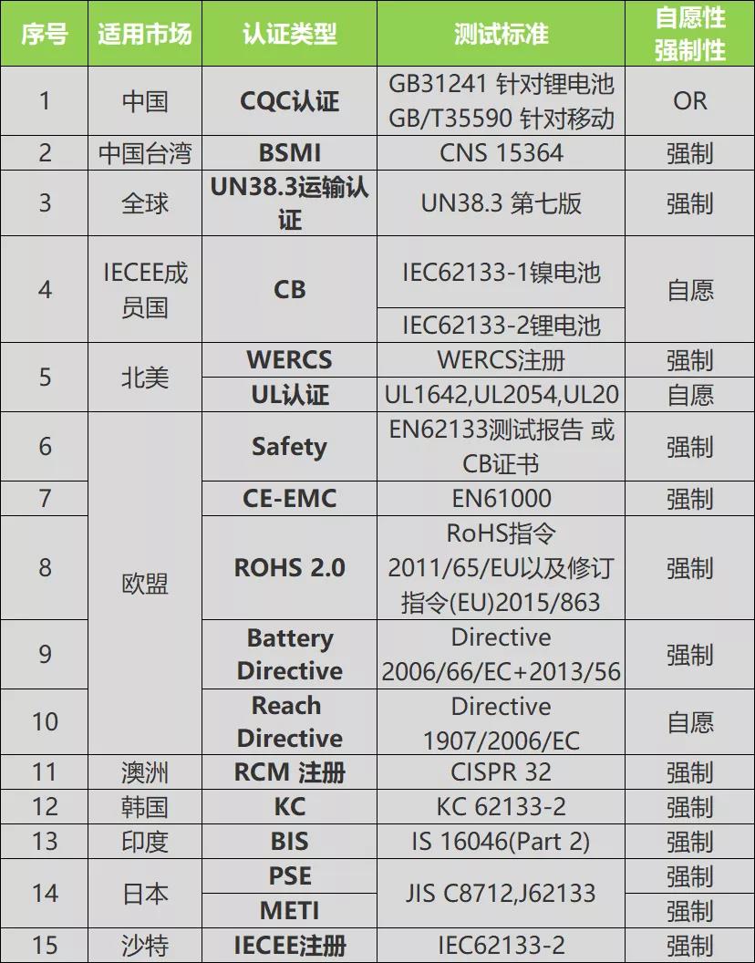 電池的使用在人們生活中十分常見并且非常重要。高質(zhì)量的、安全的電池產(chǎn)品對各行各業(yè)和消費者來說,也是非常的關注。那么我們怎么判定電池是否安全呢?每個市場對于安全的標準都不一樣,下面我們看一下電池產(chǎn)品進入不同市場需要具備的質(zhì)量標準認證類型: