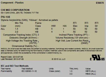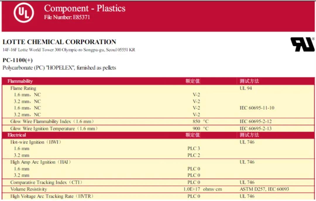 NC為天然色(無著色的顏色)BK為黑色ALL為全部顏色。Min.Thick.試片最小厚度單位為mm。在上述黃卡中,試片厚度為3mm時(shí),難燃性為5VA。試片厚度為1mm時(shí),難燃性為5VB。