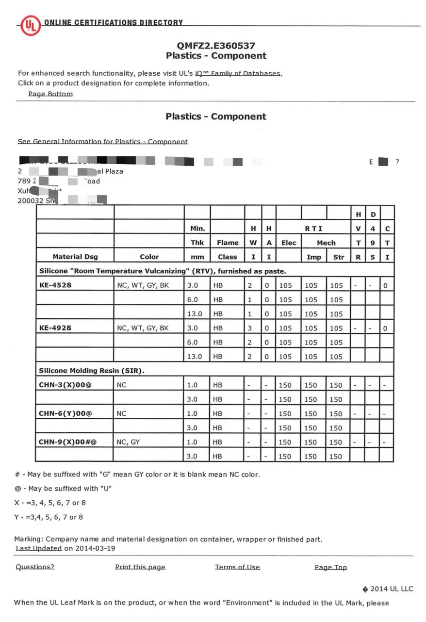 Min. Thick. 試片最小厚度單位為mm。在上述黃卡中,試片厚度為0.75mm時(shí),對(duì)應(yīng)的阻燃等級(jí)為V-2。試片厚度為3mm時(shí),對(duì)應(yīng)的阻燃等級(jí)為V-0,5VB。