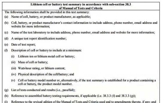 關于鋰電池檢測的第38.3章節(jié)的部分內(nèi)容修訂有兩處: "i驗概要Lithium cell and battery testsummary" 中: 38.3.5()(i)原"質(zhì)量(Mass) "更改為“電池或電池組質(zhì)量(Mass of cell orbattery) ";