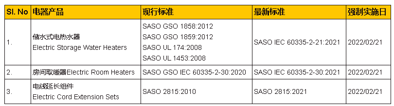 儲水式電熱水器/房間取暖器/電線延長組件SASO標(biāo)準(zhǔn)更新