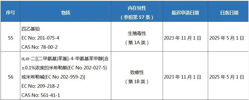 REACH法規(guī)附錄XIV(授權(quán)物質(zhì)清單)新增物質(zhì)如下: