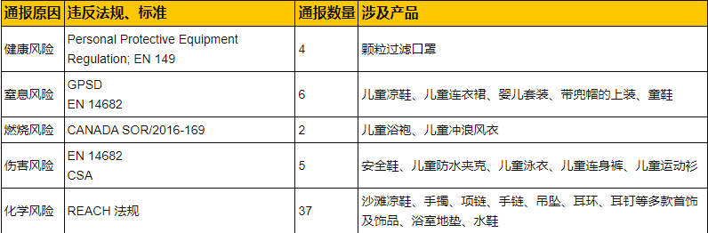加拿大市場物理類召回3例,其中1例為安全鞋沖擊性能測試不符合要求,可能構(gòu)成傷害風(fēng)險(xiǎn);2例兒童浴袍、兒童沖浪風(fēng)衣不符合易燃性要求,可能對兒童構(gòu)成燒傷風(fēng)險(xiǎn)。加拿大市場無相關(guān)化學(xué)召回案例。