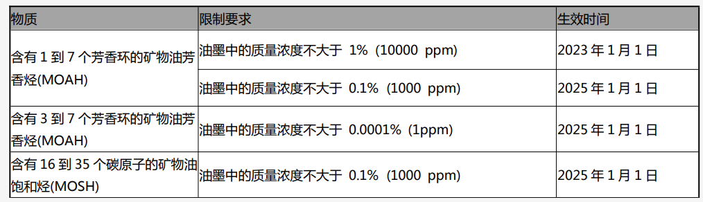 (2)在每個截止日期前制造或進(jìn)口的紙質(zhì)包裝和印刷品,如果符合在這些截止日期之前的含量要求,將有自這些截止日期起12個月的庫存處理期。就本法令而言,礦物油是指從用于制造油墨的石油烴衍生的原料生產(chǎn)的油。礦物油作為復(fù)雜的碳?xì)浠衔?,主要包括直鏈、支鏈烷烴和烷基取代的環(huán)烷烴(MOSH)以及烷基取代的芳香烴(MOAH)兩大類。通過飲食攝入人體內(nèi)的礦物油易在人體內(nèi)發(fā)生集聚,給人體健康帶來巨大的損害。2017年10月27日,世界衛(wèi)生組織國際癌癥研究機(jī)構(gòu)公布的致癌物清單中,將未經(jīng)處理或輕度處理的礦物油列入1類致癌物清單,礦物油、高精煉油在3類致癌物清單